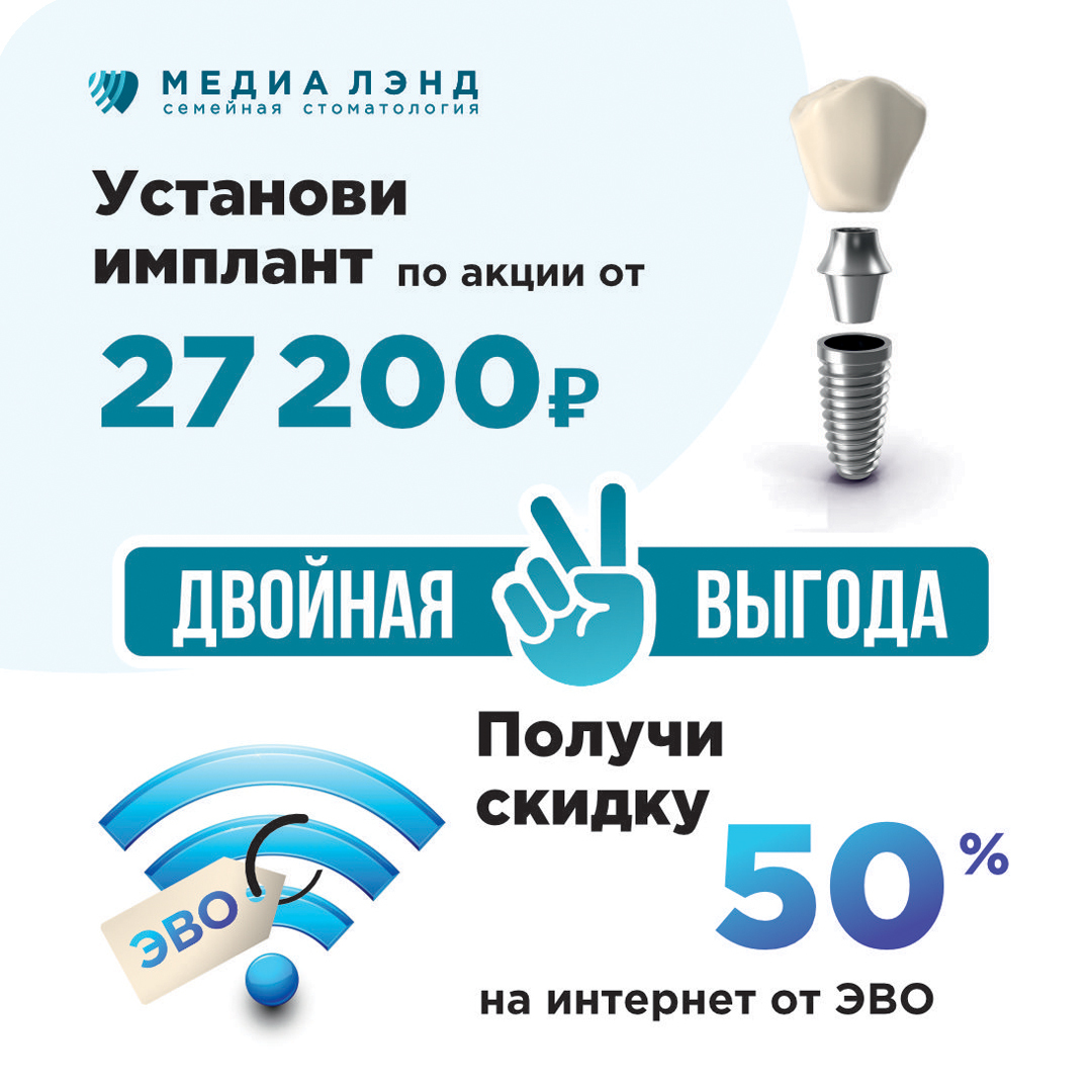 Сделай имплантацию зубов по акции от 27200 руб и получи сертификат со скидкой 50% на оплату интернета от ЭВО*.